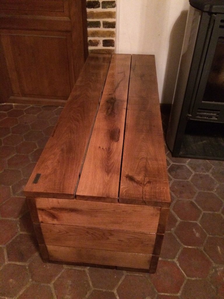 Coffre Bois 150 cm x 46 cm x 52 cm Chêne de France Massif, Idéal pour stocker vos Buches ou chaussures à proximité immédiate de votre cheminée, Coffre extrêment robuste grâce à la qualité du bois et à son traitement hydrofuge sur toutes les faces, Ventilation sur toutes les faces, 2 Charnières inox robustes, Doubles Vérins pour faciliter l’ouverture, Epaisseur des planches de chêne de 3 cm, Coffre en chêne de France, massif et hydrofuge, 150 cm x 46 cm x 52 cm sur Patins Bois. Fabrication 100 % française,