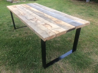 Table en chêne français avec traverses de 20 cm x 5 cm, vieillies et assemblées sur pieds en acier peint 250 cm x 100 cm x 5 cm – Fabrication 100 % française – Chêne de Bourgogne – Assemblage non collée par vis en sous face sur platine acier. Pied réglable. Facilement démontable pour le transport
